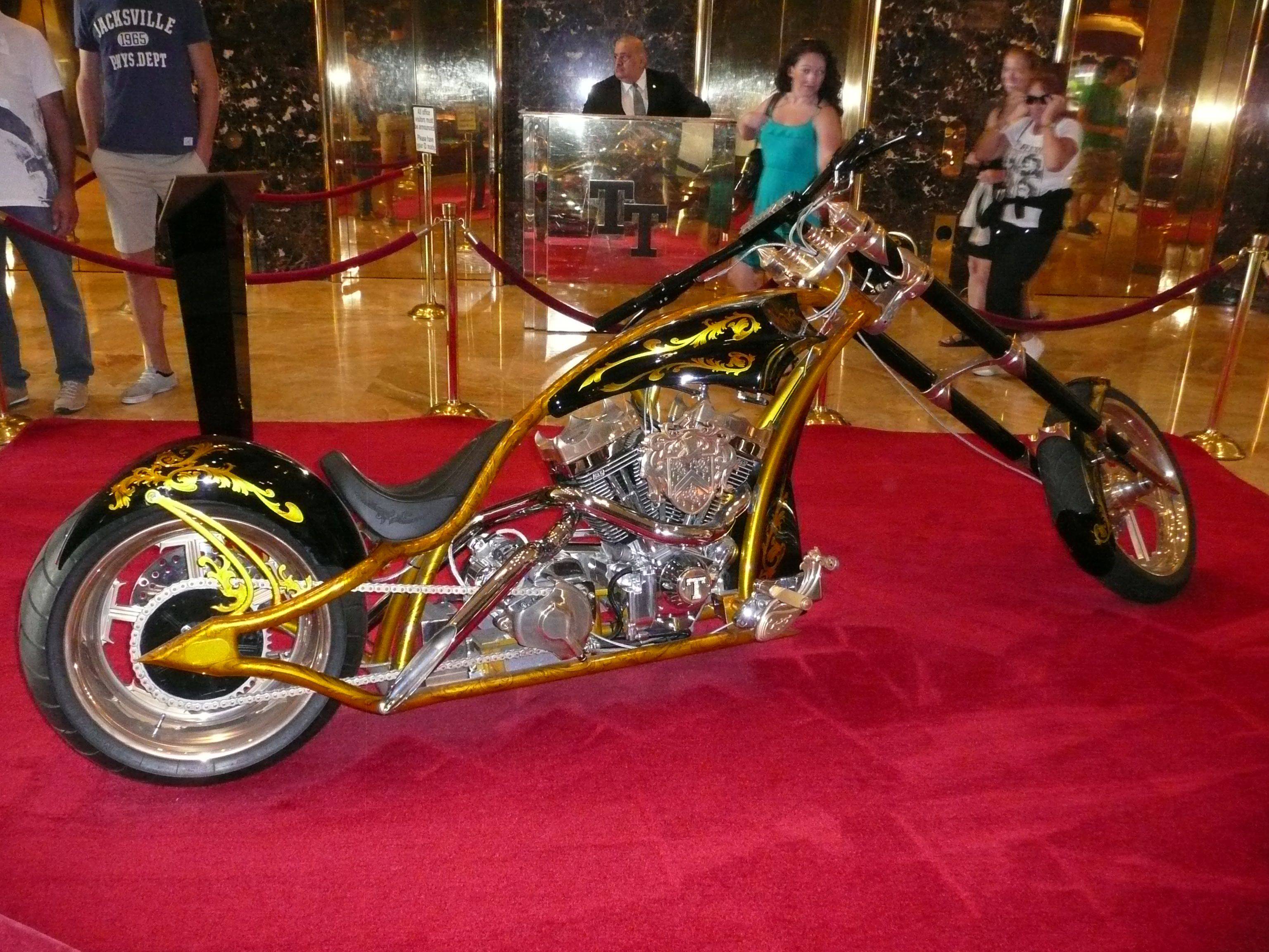 In 2012 verscheen een zekere blonde zakenman-en nu een van de machtigste mannen ter wereld—in American Chopper: Senior vs Junior. Zoals verwacht, De Donald vroeg om iets schandelijk en duur, met Paul Senior en Paul Junior enigszins in slagen om te leveren. Dat klopt, het eindproduct was belachelijk, ijdel, en ongelooflijk over-the-top, net als de persoon die het eiste. Wat verwacht je van een man met een gouden lift en toilet? Tot overmaat van ramp had de chopper gouden stuur, gouden wielen en een grote “T” op het pedaal, voor het geval iemand vergat van wie het was.